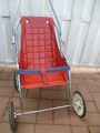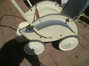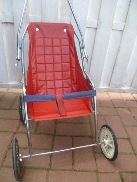 optisch eher ungewöhnlicher Sportwagen mit sehr schmaler Schiebestange ... OHNE Strampelchen ... aber zum Größenvergleich ist es natürlich ideal : das Strampelchen ist 55 cm groß ..