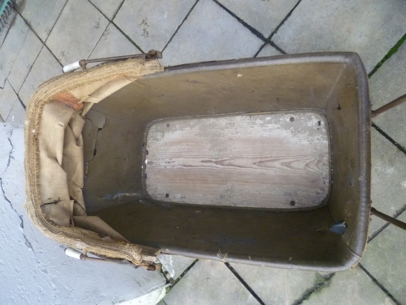 Das Wachstuch am Verdeck & am Innenausschlag weist Risse auf - am Korbgeflecht ist eine Bruchstelle und eine kleine Fehlstelle vorhanden - im Anbetracht des Alters aber in sehr gutem Zustand :)