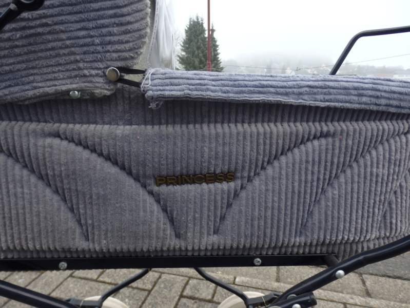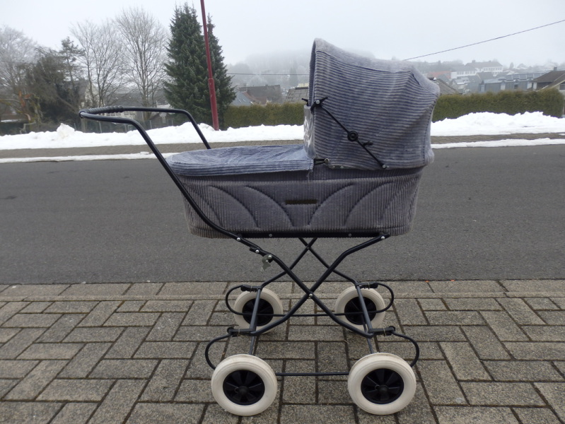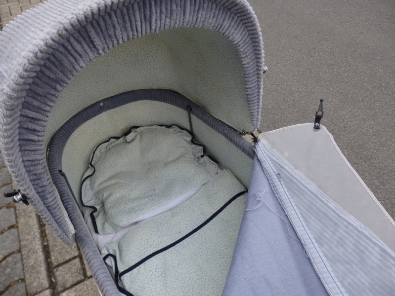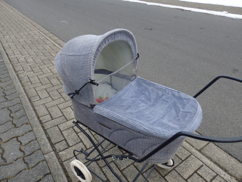 Dieser Princess Puppenwagen aus grauem Baumwollcord stammt aus den 80er Jahren & bringt seine original Wagengarnitur mit.